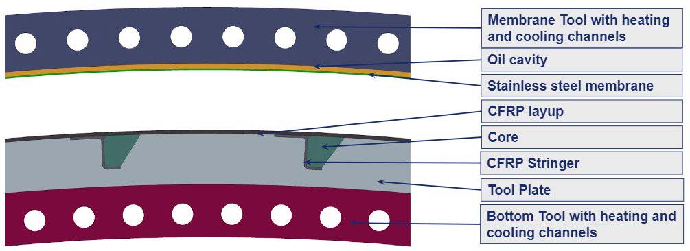 Hydrostatische Membranpresstechnik für Verbundwerkstoffe: Verwendet wird eine dünne, flexible Stahlmembran für die Druckanwendung beim Herstellen von Verbundwerkstoffen. Damit werden Nachteile und Toleranzprobleme des Werkzeugeinsatzes bei hart-hart-Kombinationen gemildert. Die Flexibilität der Membran gleicht alle Stärketoleranzen im Laminat aus und sorgt so für eine hochqualitative Verfestigung.