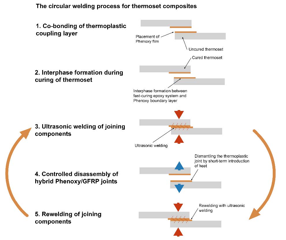 Rundschweißverfharen für duroplastische Verbundwerkstoffe: Ein schnelles Schweißverfahren zum Herstellen von Hochleistungsverbindungen zwischen schnell aushärtenden Epoxidharz-Verbundwerkstoffen mit einer kombinierten thermoplastischen Zwischenschicht, die eine recyclingfähige Konstruktion ermöglicht.
