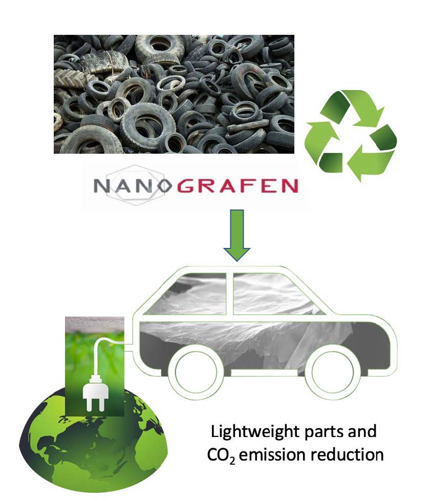 Graphen aus Altreifen für Leichtfahrzeuge: Nanografen stellt per Pyrolyseverfahren Graphen aus Altreifen im Pilotmaßstab her, das als zusätzliche Verstärkung im Compoundierverfahren für kostengünstige und leichte Automobilverbundwerkstoffe verwendet wird.