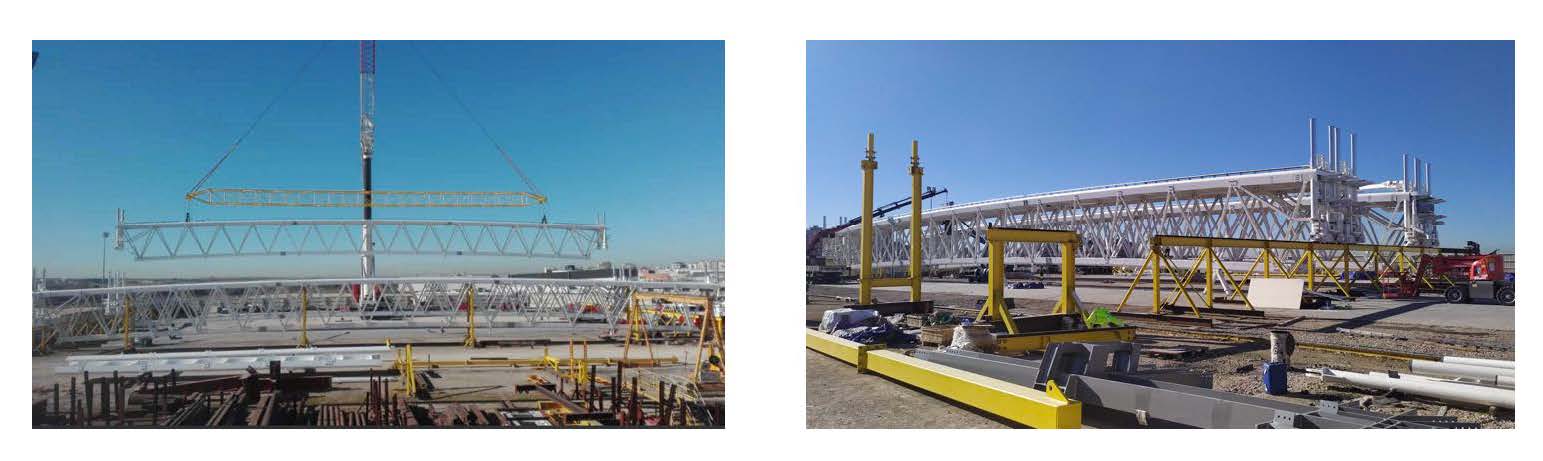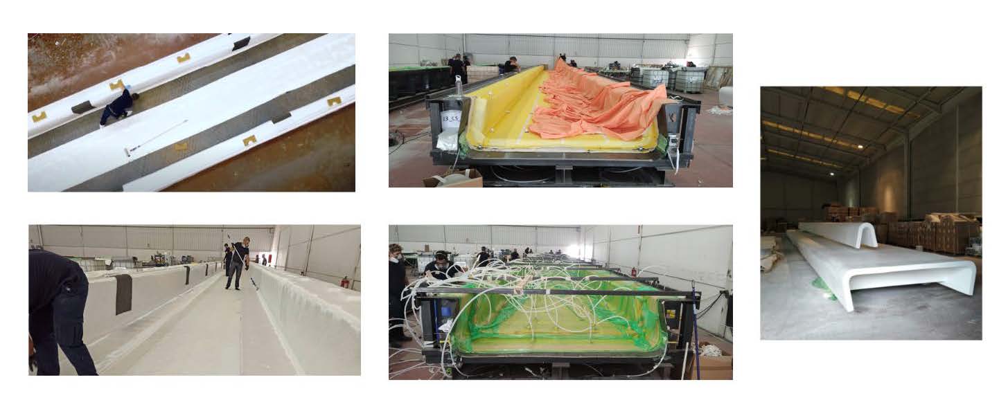Verbundwerkstoffdach für das Stadion von Real Madrid: Drei Elemente werden mechanisch verbunden, um Träger mit einer Spannweite von 75 Metern zu erreichen. Hergestellt wurden die Träger über Infusion mit doppelter VAP-Membran, wodurch Löcher im Kern und überschüssiges Polymer vermieden wurden.