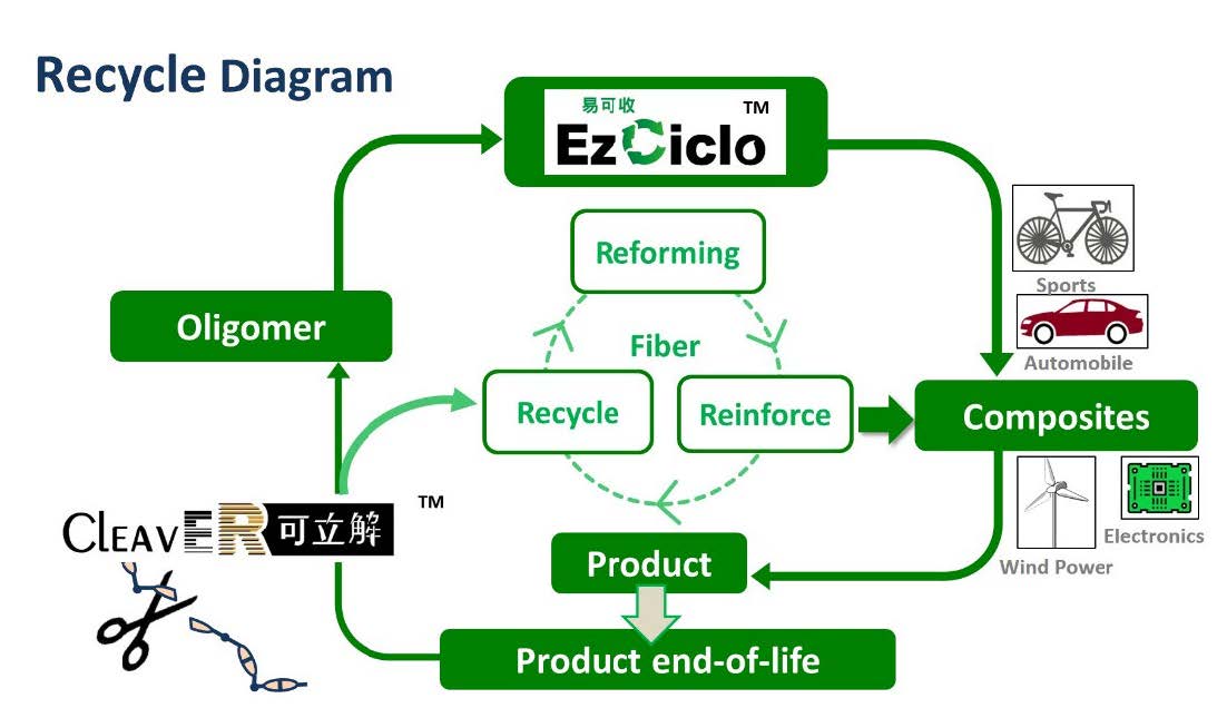 Fahrrad aus duroplastischem CFK wurde aus recycelbarem Ezciclo Prepreg hergestellt. Verbundwerkstoffteile können mit der CleaVER-Flüssigkeit recycelt werden, um Harz und Fasern zurückzugewinnen und so einen geschlossenen Recyclingkreislauf für duroplastische Verbundwerkstoffe zu ermöglichen, nahezu ohne die mechanischen Eigenschaften der Fasern zu beeinträchtigen.