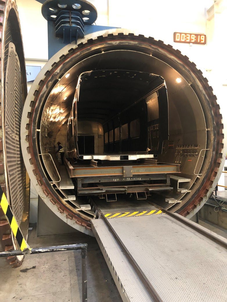 Wagon-Karosserie eines Hochgeschwingkeitszuges aus Verbundwerkstoff: hybride Verbundwerkstoff-Karosseriestruktur für Hochgeschwindigkeitszüge aus CFK-Verbundwerkstoff und Aluminium mit einer Gewichtsreduzierung von 25 Prozent. Der Prototyp ist ein kompletter Wagenkasten eines Zwischenwagens des Talgo 350 im Maßstab TRL 6/7 1:1.