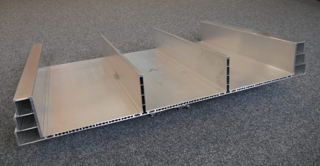 Die Besonderheit der preisgekrönten Lösung In der Kategorie Transport liegt in der hohen Flexibilität in den Abmessungen, die eine Anwendung in Pkw und Lkw ermöglichen. Außerdem werden die einzelnen Profile durch ein innovatives, mechanisches Kaltfügeverfahren verbunden, das ohne Wärmeeinfluss arbeitet. Damit ist es möglich, die einzelnen Hohlkammern der Profile flüssigkeitsdicht zu verbinden. Die seitlichen Profile dienen überdies als äußere Crashelemente.