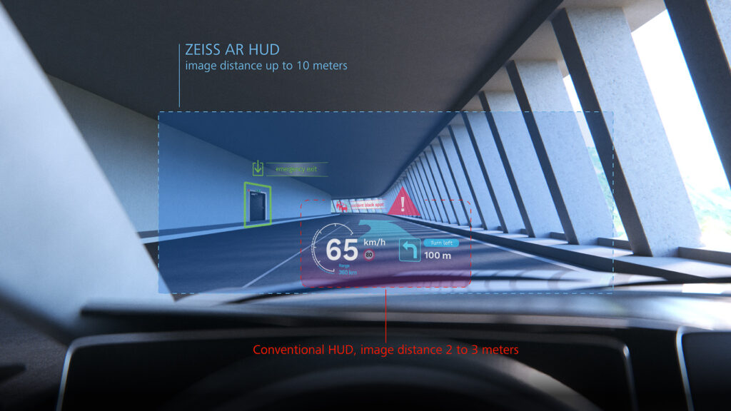 Bild oben: Ultrakompakte, holografische Augmented-Reality-HUDs projizieren mit der Zeiss-Technologie ein komplettes Sichtfeld (Field of View) als virtuelles Bild in die Windschutzscheibe. (Quelle: Carl Zeiss)