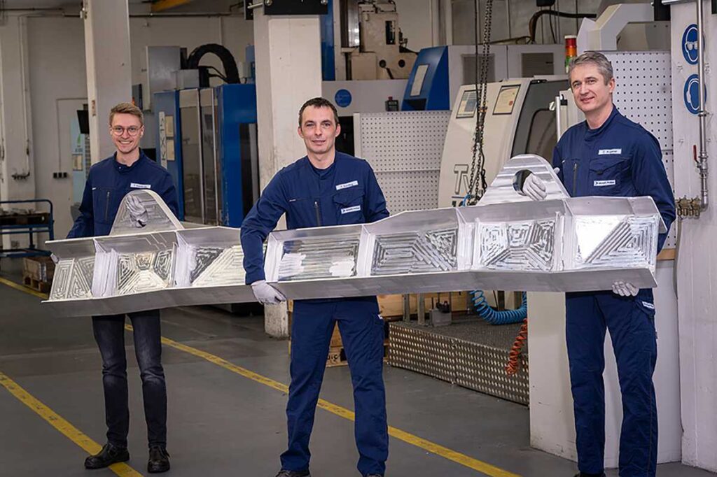 Bild oben: Mitarbeiter aus Karlsruhe mit einem gefrästen Flugzeugteil (Quelle: Amag Components)