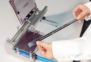 Der Folding Frame erzielt mit Schaumstoffklebebändern eine schnell aushärtende und saubere Klebelösung. Mit dem zugehörigen Folding Frame System lässt er sich exakt – beispielsweise auf Displays – positionieren.