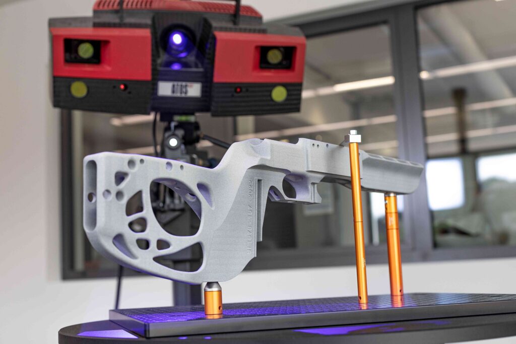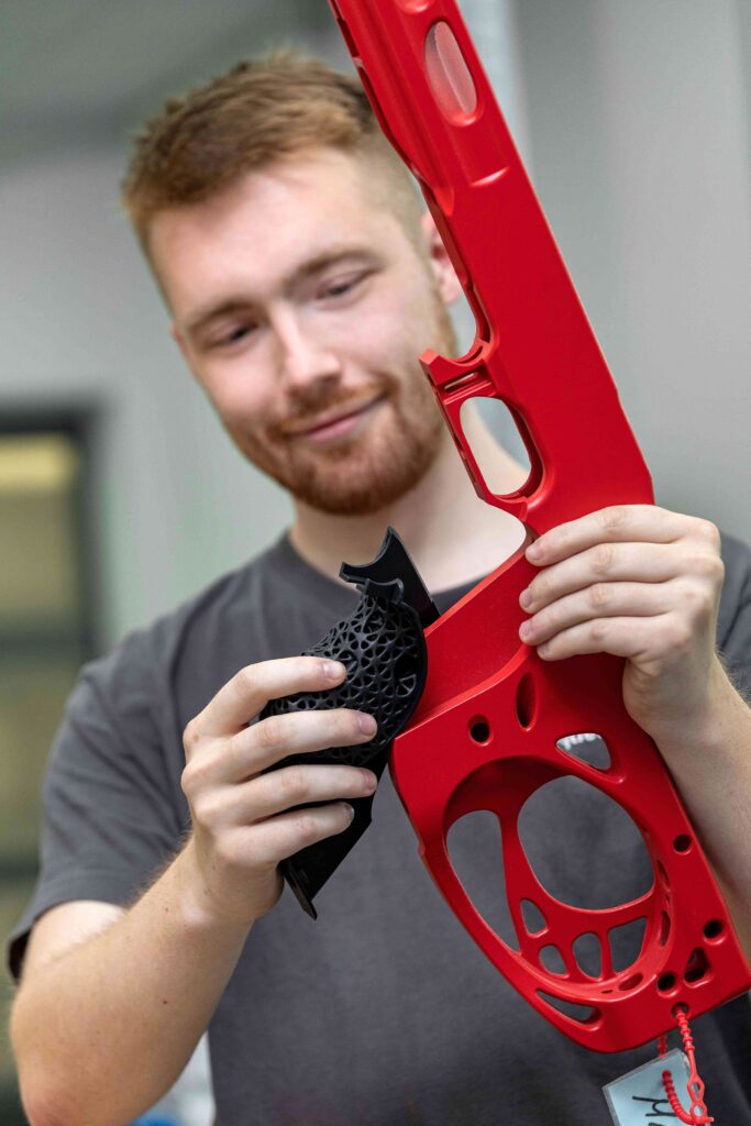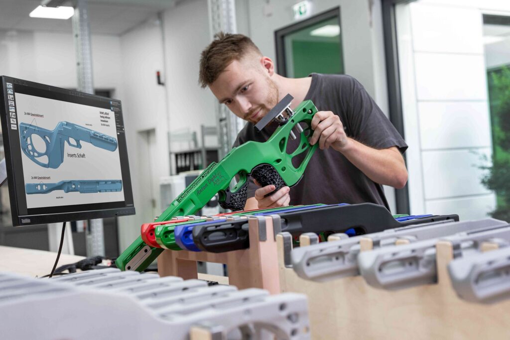 Der Schaft des 1827 F Bionic von J.G. Anschütz für ein Biathlongewehr steht exemplarisch für die zunehmende Integration bionischer Konstruktionsprinzipien und des Lasersinterns zur Serienfertigung komplexer Kunststoff-Formteile. Der Schaft des Gewehrs ist individuell auf den Athleten zugeschnitten, um einen optimalen Komfort und eine möglichst hohe Präzision zu erreichen.