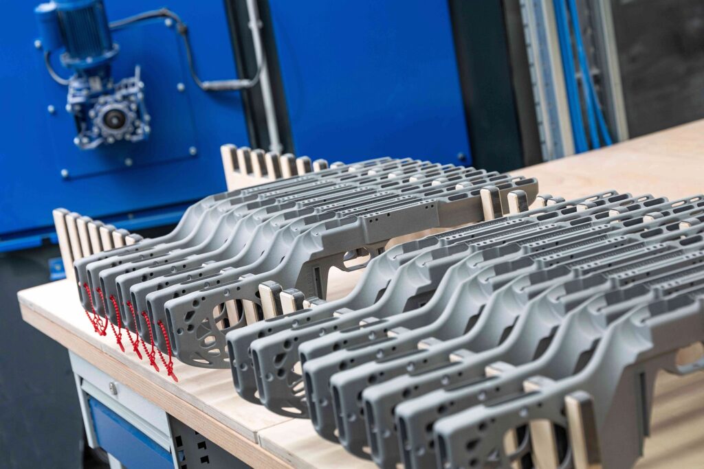 Die verwendete additive Fertigungsmethode des mit der Produktion beauftragten Unternehmens FKM – die SLS-Technologie (Selektives Lasersintern) – lässt sich zum Realisierungen hochfunktionaler Produktdesigns vielfältig einsetzen. Ihre Stärke ist die wirtschaftliche Produktion kleiner Losgrößen.Für die flexible Fertigung der bionischen Schäfte sowie der in mehreren Varianten angebotenen Griffstücke und Mittelhandstützen setzt FKM einen auf Polyamid 12 basierenden Spezialwerkstoff ein. Er ist sehr robust und verträgt Temperaturen deutlich unter der Null-Grad-Grenze. Für Versuchs- und Testzwecke sowie für die geometrisch-konstruktive Weiterentwicklung wird der Schaft in hellgrau, weiß und schwarz mit einer technischen Oberfläche gefertigt; für die Serie hingegen wird er in den vom Kunden vorgegeben Farben lackiert.