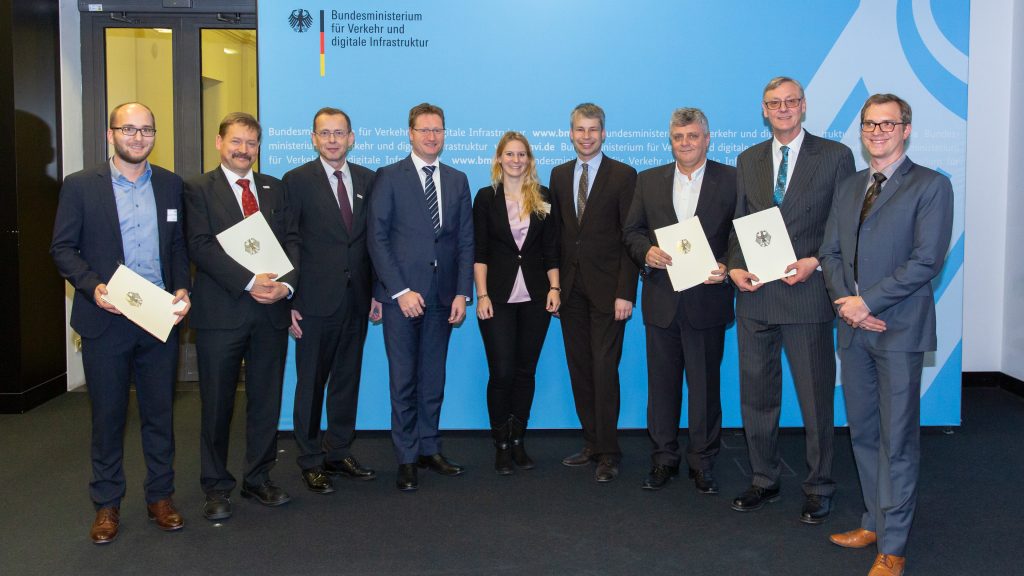 Bild oben: Nadine Magura, wissenschaftliche Mitarbeiterin am IKV (Mitte) bei der Verleihung der Förderurkunde im BMVI in Berlin; neben ihr (re) Steffen Bilger; links im Bild Daniel Schneider, Abteilungsleiter für FVK am IKV. (Quelle: BMVI)