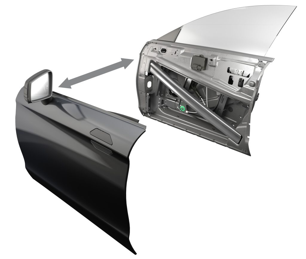 Bild oben: Die Funktionsintegration der CFK-Türstruktur ermöglicht, die Zahl der Bauteile und damit die Kosten zu verringern. Lediglich die Außenhaut muss noch eingehängt und verschraubt werden, was den Montageaufwand beim Autohersteller erheblich reduziert (Quelle: Brose, 2013)