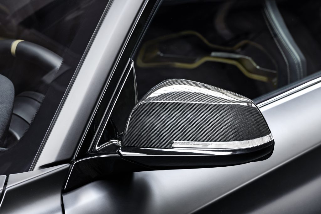 Die Sportsitze aus dem Leichtbauwerkstoff bieten Halt auch bei sehr dynamischer Fahrweise. Sie sind 9 kg Kilogramm leichter als die serienmäßigen Sportsitze. Die Leichtbaurücksitze senken das Fahrzeuggewicht um weitere 13 kg. Unverwechselbares Motorsport-Feeling im Cockpit bietet das Lenkrad – ebenfalls aus Carbon. Es ist im oberen und unteren Teil mit Leder bezogen.