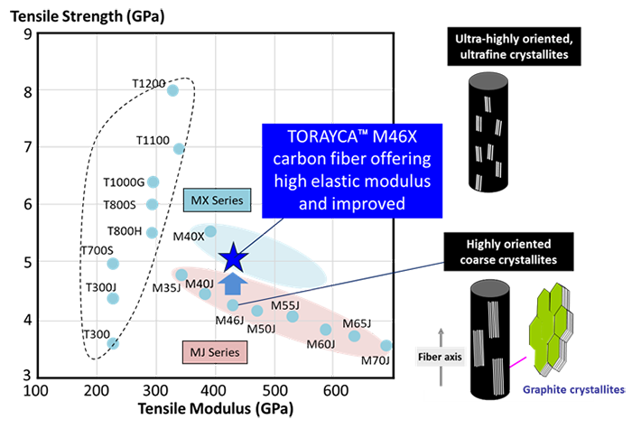 Die Torayca M46X Carbonfaser ist etwa 20 Prozent fester als andere Fasern der MX Serie von Toray Industries und besitzt dennoch ein hohes E-Modul. Die Faser trägt zur weiteren Gewichtsreduktion kohlenstofffaserverstärkter Kunststoffe bei und besitzt eine Eigenschaftskombination, die besonders im Sport- und Freizeitbereich gesucht ist.
