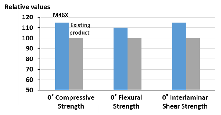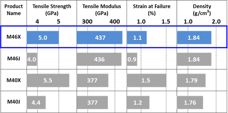 Die Erhöhung der Festigkeit unter Beibehaltung des E-Moduls von Kohlenstofffasern von mehr als 350 GPa stellt eine technologische Herausforderung dar. Mit dieser Eigenschaftskombination können bei gleicher Leistung weniger Kohlenstofffasern verwendet werden, um das Gewicht der Formteile zu verringern. Im M46X Prepreg wird eine spezielle Harzmatrix genutzt, die die Druckfestigkeit verbessert. Bei erhöhter Steifigkeit und gleicher Festigkeit kann das Gewicht der fertigen Produkte reduziert und ihre Anwendungsmöglichkeiten erweitert werden.