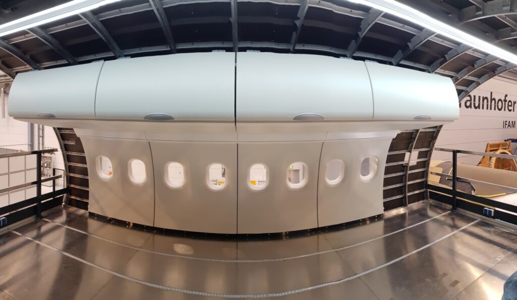 Bild oben: Die gewichtsparenden Handgepäckfächer und Kabinenseitenwände nach der automatisierten Montage im Flugzeugrumpf-Demonstrator. (Quelle: Fraunhofer IFAM | Miguel Vargas)