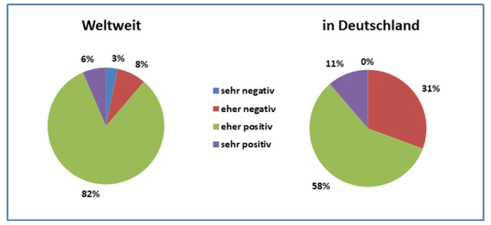 Bei der letzten Befragung vor zwölf Monaten hatten noch 79% der deutschen Unternehmen die Situation als positiv beurteilt. Weltweit wird die aktuelle generelle Geschäftslage dagegen von 88% der Befragten als positiv oder sogar sehr positiv eingeschätzt.