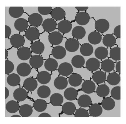 Bild oben: Mikromechanische Simulation: berechnete Matrixrisse (schwarze Bereiche) bei Ermüdungsversagen durch kryogene Temperaturwechsellast. (Quelle: Institut für Faserverbundleichtbau und Adaptronik)