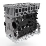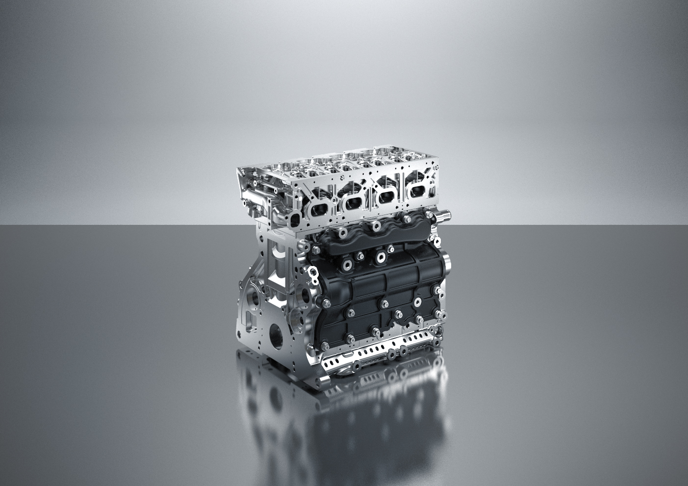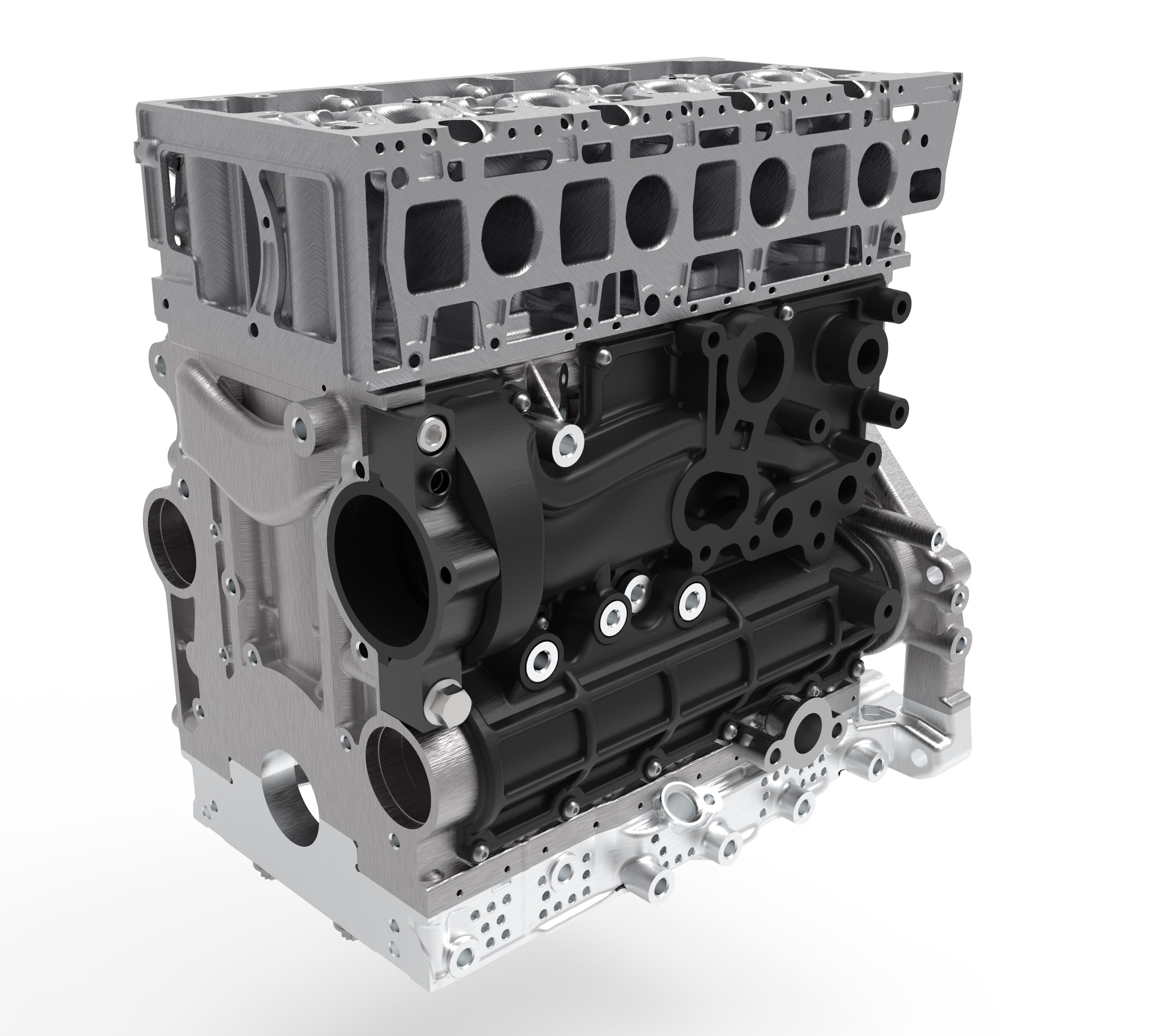 Aus Gewichts- und Steifigkeitsaspekten fiel beim Kurbelgehäuse die Wahl auf ein Short-Skirt-Design mit einer Alu-Unterkonstruktion (Bedplate). So konnte das Gewicht gegenüber der Originalkomponente um 5,1 kg gesenkt werden. Die Schottwände des Kurbelgehäuses erhielten offene, horizontale Belastungsstrukturen, die an geeigneten Stellen ein Kreuzrippenverbund versteift. Für zusätzliche Verstärkung sorgen zwei gewichtsreduzierte Verbindungsrohre im Bereich der Ausgleichswellen. Auf Basis von Topologie-Analysen wurden niedrigbelastete Zonen durch Gitternetze (Lattice-Strukturen) und Hohlräume optimiert. Die Seitenabdeckungen des Kurbelgehäuses bestehen nun aus glasfaserverstärktem Phenolharz und sind dadurch etwa 15 Prozent leichter.