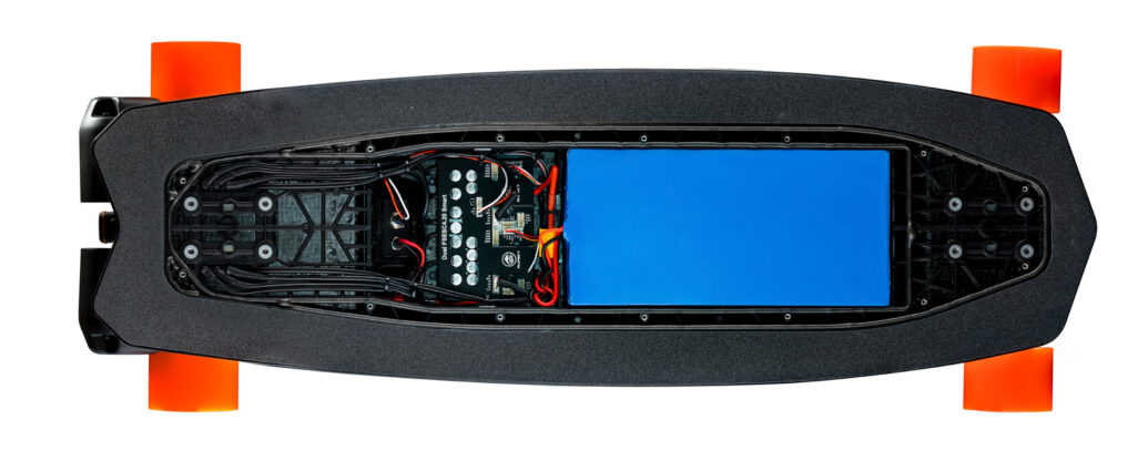 Anstelle eines Stehdecks mit darunter angebrachter Kunststoffbox wurde für dieses E-Skateboard das Deck wannenförmig gestaltet. Im Hohlraum finden sämtliche elektrischen und elektronischen Funktionen inklusive Batterie Platz. Die Wanne wird mit einem Deckel verschlossen. Gefertigt aus Tepex dynalite im Hybrid-Molding-Verfahren konnte sie mit einer Wandstärke von nur drei Millimeter ausgelegt werden. Trotz der dünnen Wände sind die elektrischen und elektronischen Komponenten im Deck sicher vor Stößen und auch Feuchtigkeit geschützt.