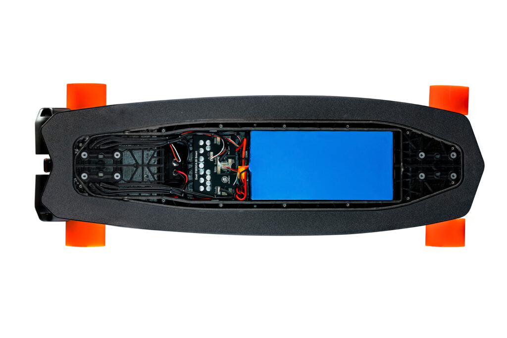 Anstelle eines Stehdecks mit darunter angebrachter Kunststoffbox wurde für dieses E-Skateboard das Deck wannenförmig gestaltet. Im Hohlraum finden sämtliche elektrischen und elektronischen Funktionen inklusive Batterie Platz. Die Wanne wird mit einem Deckel verschlossen. Gefertigt aus Tepex dynalite im Hybrid-Molding-Verfahren konnte sie mit einer Wandstärke von nur drei Millimeter ausgelegt werden. Trotz der dünnen Wände sind die elektrischen und elektronischen Komponenten im Deck sicher vor Stößen und auch Feuchtigkeit geschützt.
