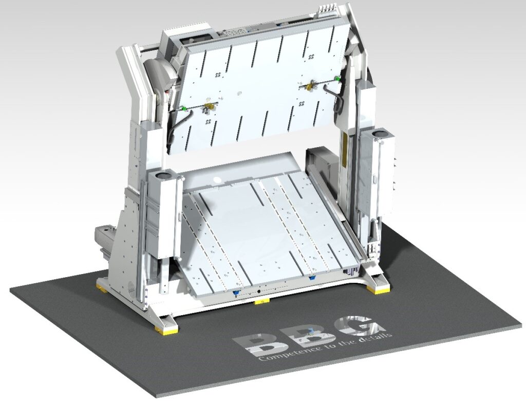 Die Aufspannplatten der Formen sind 2.200 × 1.500 mm groß. Dank integrierter pneumatischer Rollenleisten lassen sich die Formen mit geringem Kraftaufwand bewegen und positionieren. Der Verfahrwinkel der unteren Trägerplatte beträgt null bis 27 Grad, der der oberen Platte null bis 75 Grad. Dadurch lässt sich die Presse so weit öffnen, dass der Bediener bequem an die Form herankommt. Die maximale Kapazität beträgt 3.500 kg für die untere Platte und 3.000 kg für die obere Platte. Dank intelligenter Druckregelung ist eine Presskraft von 535 kN möglich.