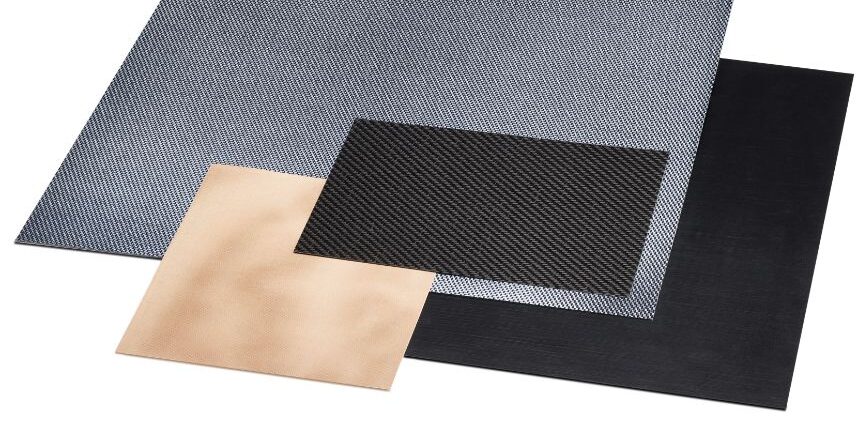 Bild oben: Thermoplastische Organobleche: Die mehrlagigen, vollständig imprägnierten und konsolidierten Faserverbundwerkstoffe werden aus Kohlenstoff- oder Glasfasergeweben und vielfältigen Matrixmaterialien hergestellt. Sie bestehen aus mehreren Lagen Prepreg- oder Semipreg-Material, die nach Kundenspezifikation aufgeschichtet und dann zu einem Zuschnitt mit einer Dicke von bis zu 5 mm gepresst werden. (Quelle: Ensinger)