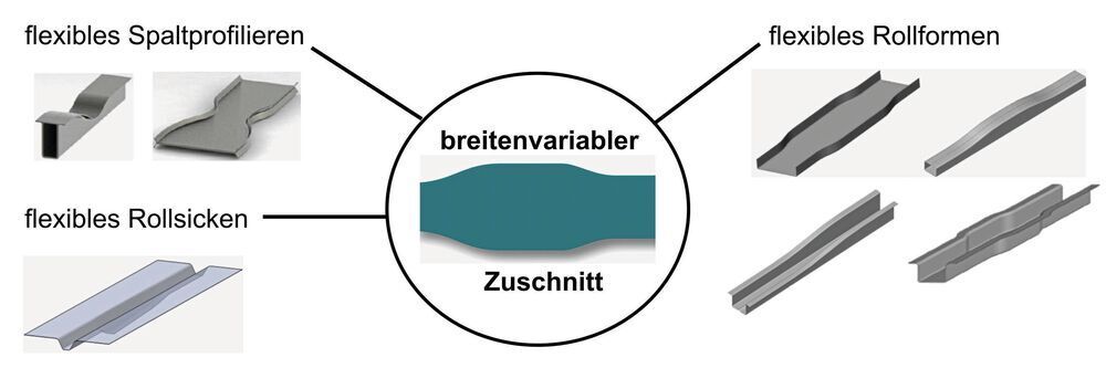 Längs- und Querträger aus Stahl oder NE-Werkstoffen sind Strukturbauteile im Leichtbau. Man findet sie in unterschiedlichen Anwendungen von Karosserie- bis Flugzeugbau, im Bauwesen und der Energiebranche. Ein wichtiges Prinzip im Leichtbau ist die Belastungsanpassung. Für Profilbauteile bedeutet das, dass Blechdicke, Profilhöhe oder -breite variieren. Hergestellt werden solche anwendungsspezifischen Profile unter anderem mit Hilfe verschiedener flexibler Rollformverfahren oder den am Institut für Produktionstechnik und Umformmaschinen (PtU) der TU Darmstadt entwickelten Verfahren flexibles Spaltprofilieren oder flexibles Rollsicken. Mit diesen Verfahren lassen sich Profilfamilien mit entlang der Längsachse höhen- oder breitenveränderlichem Querschnitt herstellen.
