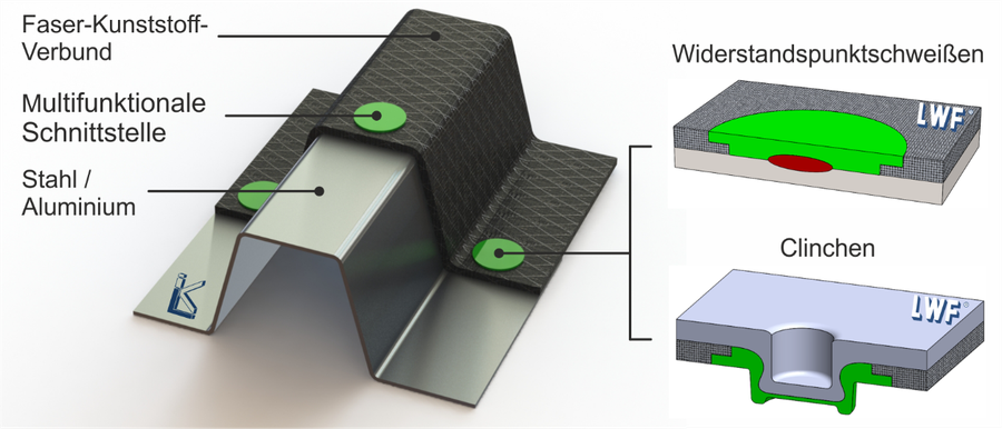Im Rahmen des Projekts „Multifunktionale Schnittstellen FKV“ (IGF-Vorhaben 20870 BG), das seit 2019 läuft, forschen Wissenschaftler am Institut für Leichtbau und Kunststofftechnik (ILK) der TU Dresden und dem Laboratorium für Werkstoff- und Fügetechnik (LWF) der Universität Paderborn an schädigungsarmen, kraftflussgerechten FKV/Metall-Verbindungen auf Basis etablierter punktueller Fügeverfahren wie Widerstandspunktschweißen (WPS) oder Clinchen.