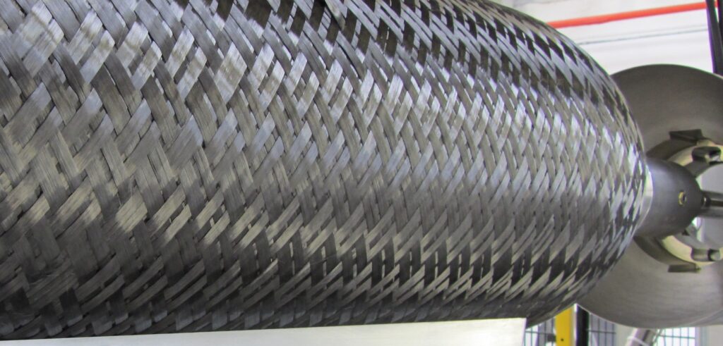 Bild oben: Zuerst werden die inneren Hüllen der Zylinder, die Liner, mit Kohlenstofffaser umflochten (Quelle: BBG).