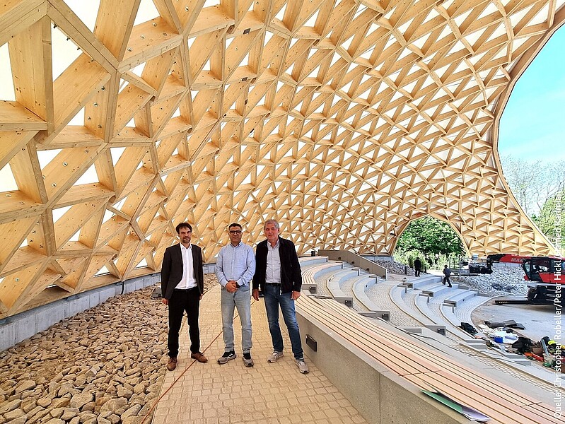 Auf der Landesgartenschau Furth im Wald 2025 wurde eine Parkarena eröffnet – geplant als dauerhafte Holzbühne für 450 überdachte Sitzplätze. Das kuppelartige Dach aus regionalem Fichten‑ und Tannenholz überspannt rund 38 Meter, misst in der Höhe etwa 15 Meter und besteht aus 168 hexagonalen Holzgitterschalen. Die Konstruktion wurde mit parametrischer Software millimetergenau vorgefertigt und komplett ohne Stahlbleche montiert – ausschließlich mit Schraubverbindungen.