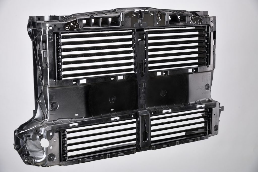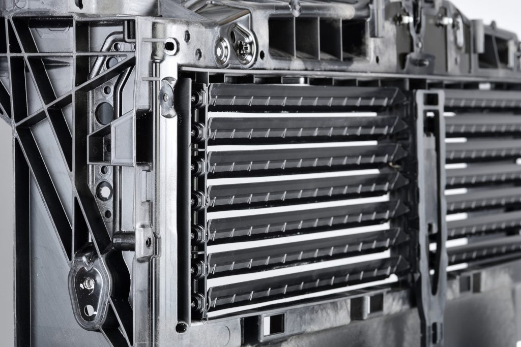 Die Hauptaufgabe der Hybridkonstruktion besteht darin, die Kühlsysteme zu tragen und in Position zu halten. In den Träger sind zudem zahlreiche weitere Funktionen integriert – so etwa Führungen, Aufnahmen für den Verstellantrieb und Befestigungselemente.