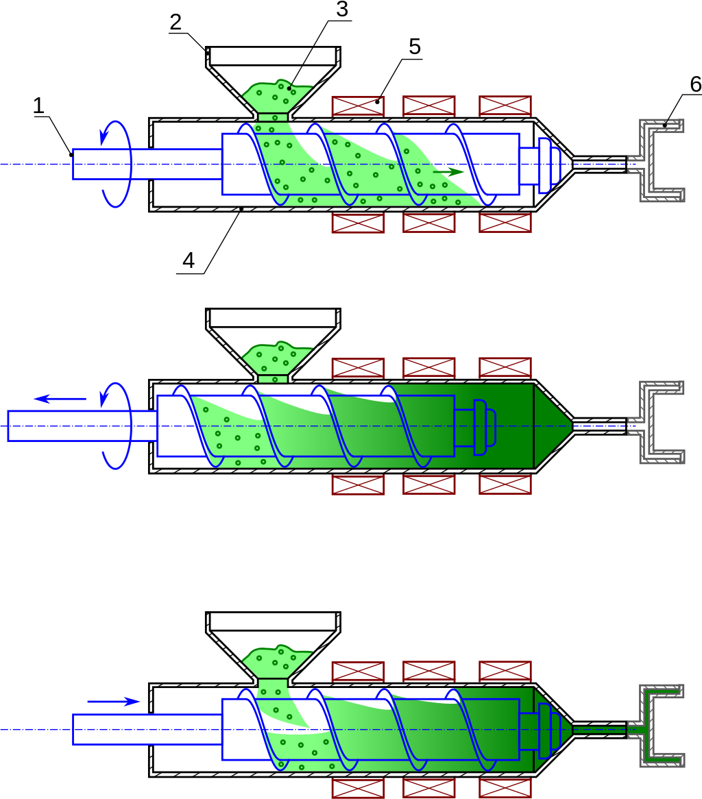 - Der Werkstoff wird in festem Zustand – meist als Granulat – der Spritzgießmaschine zugeführt und