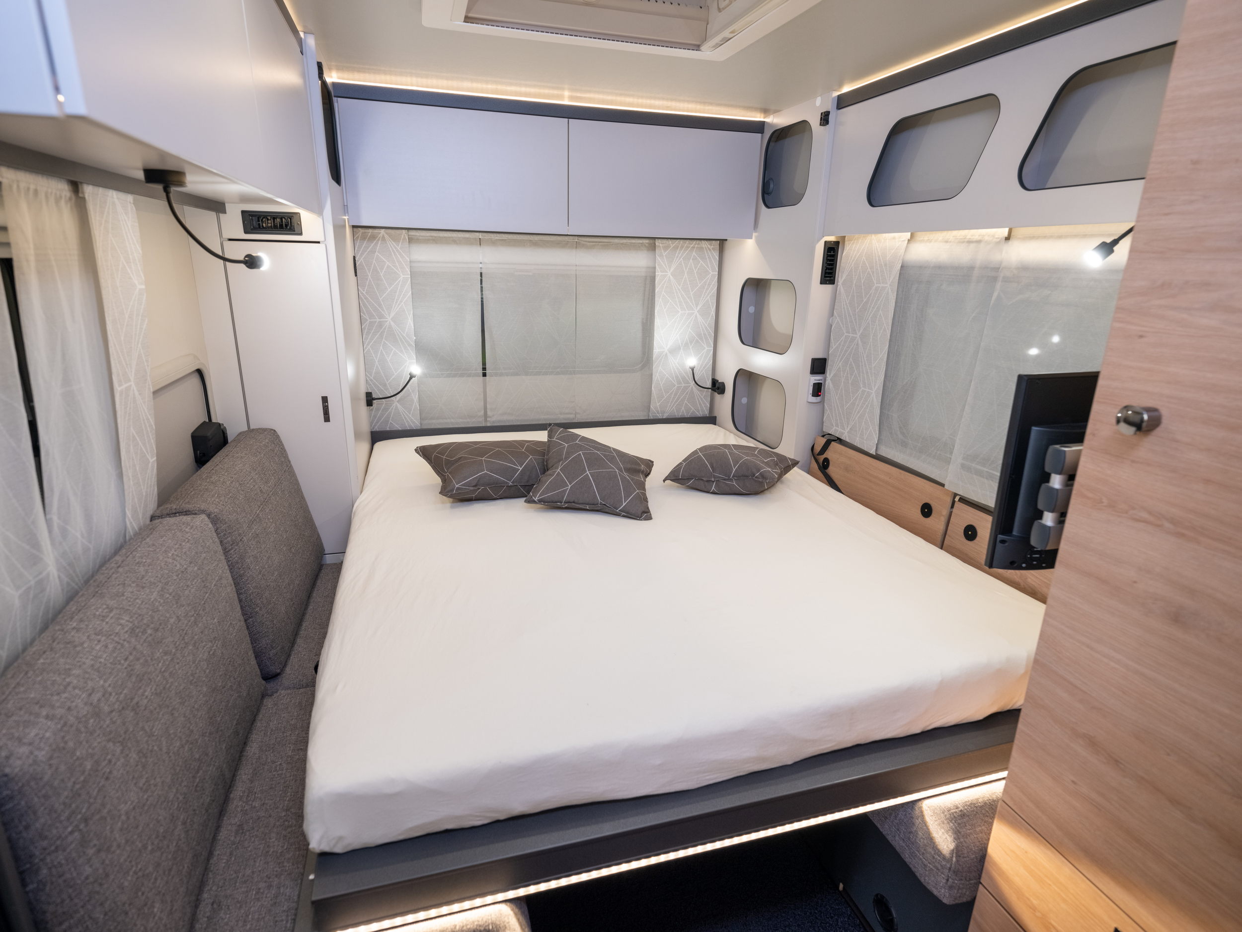 Der Nutzwert entstand durch eine Summe vieler Ideen: Dazu trägt die Anwendung der FoldXpand‐Technologie am Front‐ und Heckend bei. Weiterhin ist die so genannte Cozy‐Lounge im hinteren Teil mehr als multifunktionell gestaltet: sie als Liege‐ und Sitzbereich, genauso wie als vollwertiges Bett (1,3 x 2,0 m) für zwei Personen genutzt werden, was an sich erstmal nichts Neues ist. Doch die zur Lounge gehörende Sitzkiste neben dem Bad kann in die Lounge nach links verschoben werden und macht dann Platz für die große Duschwanne. Das Badezimmer lässt sich so über die ausklappbare Duschkabine nahezu in der Fläche verdoppeln. Das aus der Bugwand klappbare Doppelbett mit 1,60 x 2,0 m Liegefläche kann nach oben geklappt „unsichtbar‟ werden und schafft so Raum für eine Vis‐à‐Vis‐Sitzgruppe, die wiederum multifunktionell ist und zum Zusatzstauraum umgebaut werden kann.