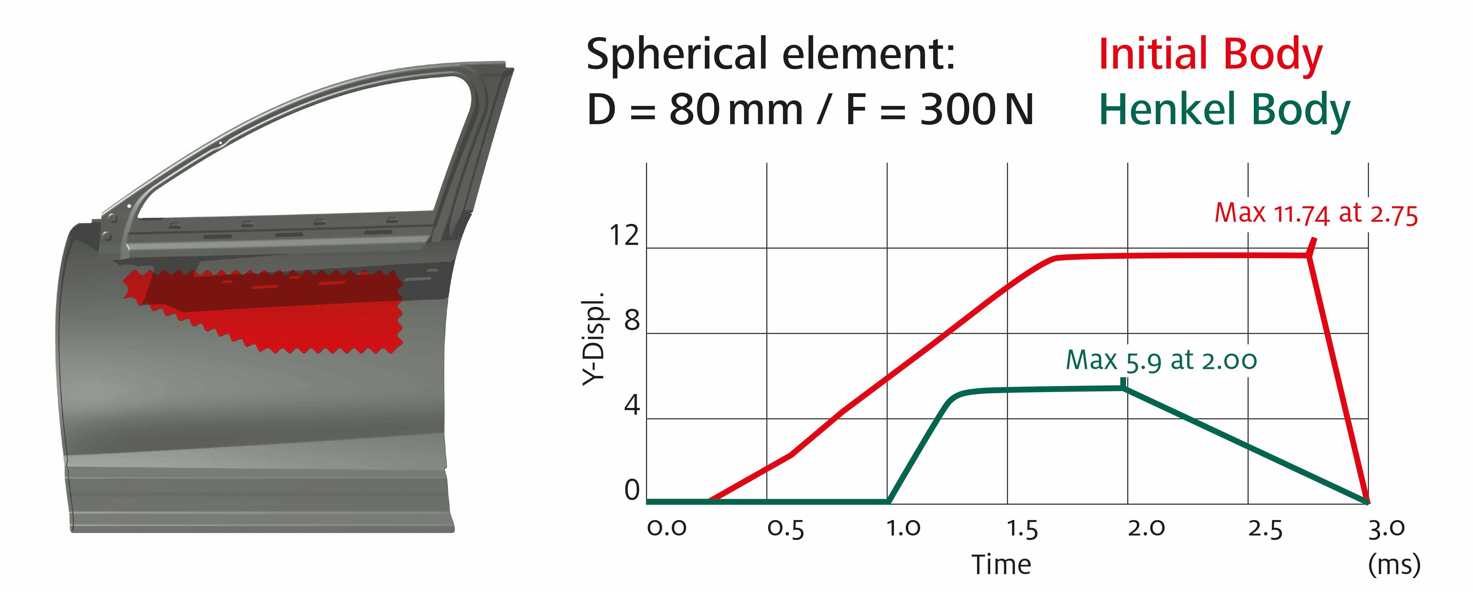Die Crashsimulationen wurden unter anderem nach Euro NCAP und Insurance Institute of Highway Safety (IIHS) bei Geschwindigkeiten von 64 bzw. 50 km/h durchgeführt. Die leichte Hybridkonstruktion mit dem Henkel-Strukturschaumstoff Teroson EP bestand all diese Tests weitestgehend innerhalb der zulässigen Grenzen zu Verformung und Eindringtiefe der Aufprallkörper.