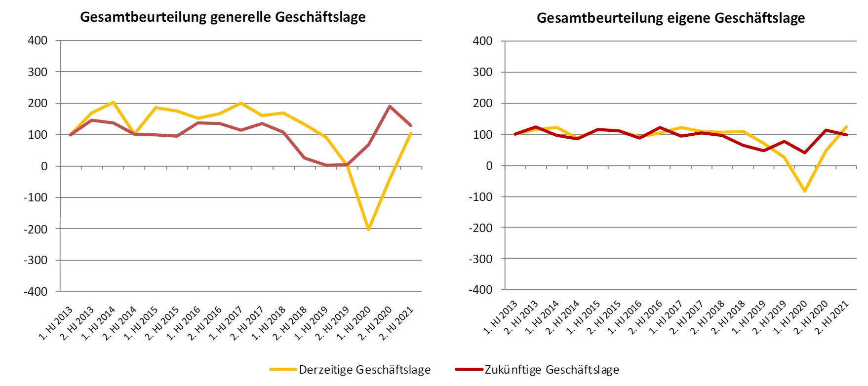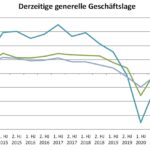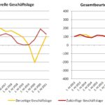 Mit 80 Prozent nochmals positiver fällt die Bewertung der eigenen Geschäftslage aus. Über alle abgefragten Regionen hinweg bewerten deutlich über 80 % der Befragten die Situation als positiv oder sogar sehr positiv. Weniger optimistisch hingegen fällt der Blick in die Zukunft aus – zu Recht, wie wir heute wissen. Der Index zeigt in zwei der drei abgefragten Regionen nach unten. Nur etwa ein Drittel der Teilnehmer geht von einer weiteren Verbesserung der Situation im nächsten halben Jahr aus.
