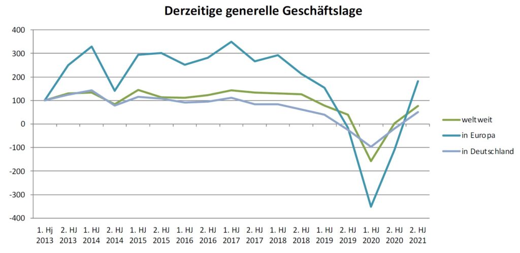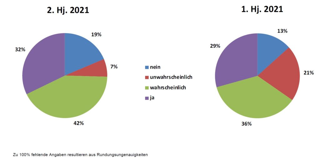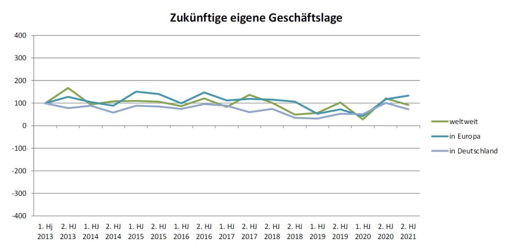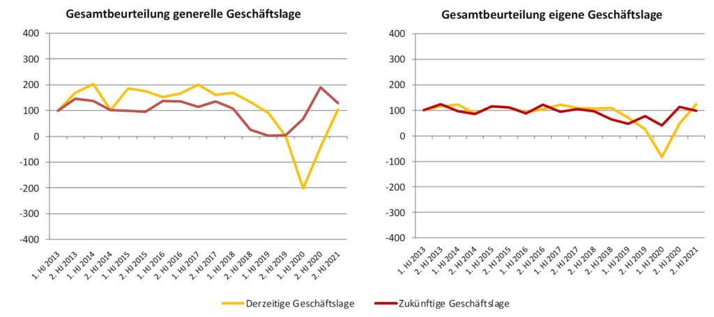 Mit 80 Prozent nochmals positiver fällt die Bewertung der eigenen Geschäftslage aus. Über alle abgefragten Regionen hinweg bewerten deutlich über 80 % der Befragten die Situation als positiv oder sogar sehr positiv. Weniger optimistisch hingegen fällt der Blick in die Zukunft aus – zu Recht, wie wir heute wissen. Der Index zeigt in zwei der drei abgefragten Regionen nach unten. Nur etwa ein Drittel der Teilnehmer geht von einer weiteren Verbesserung der Situation im nächsten halben Jahr aus.