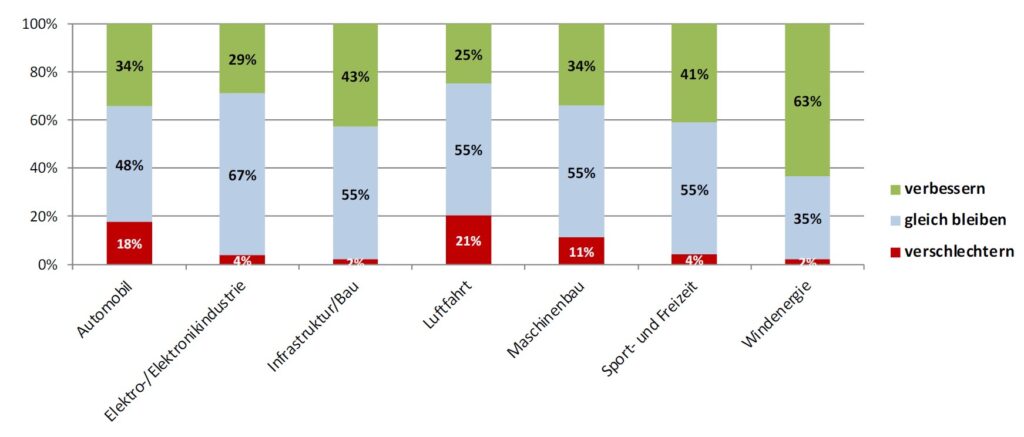 Die Erwartungen an die Anwendungsindustrien sind sehr unterschiedlich. Größere Rückgänge werden vor allem für die Bereiche Automobil, Luftfahrt und Maschinenbau erwartet. Besonders optimistisch zeigen sich die Erwartungen für Composites-Anwendungen in der Windenergie – induziert durch den erwartbaren starken Zubau an Windkraftanlagen. Außerdem positiv gestimmt ist die Branche in den Bereichen Infrastruktur-/Bau sowie dem Sport- und Freizeitbereich.