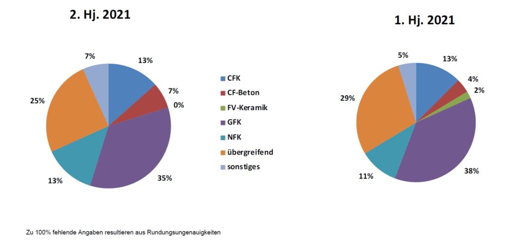 Werkstoffseitig setzt sich der Paradigmenwechsel weiter fort. Wurde von den Befragten in den ersten 13 Erhebungen stets CFK als Material genannt, aus dessen Umfeld die wesentlichen Wachstumsimpulse für den Composites-Bereich zu erwarten sind, so wird GFK nun zum vierten Mal in Folge als wichtigster Werkstoff genannt.