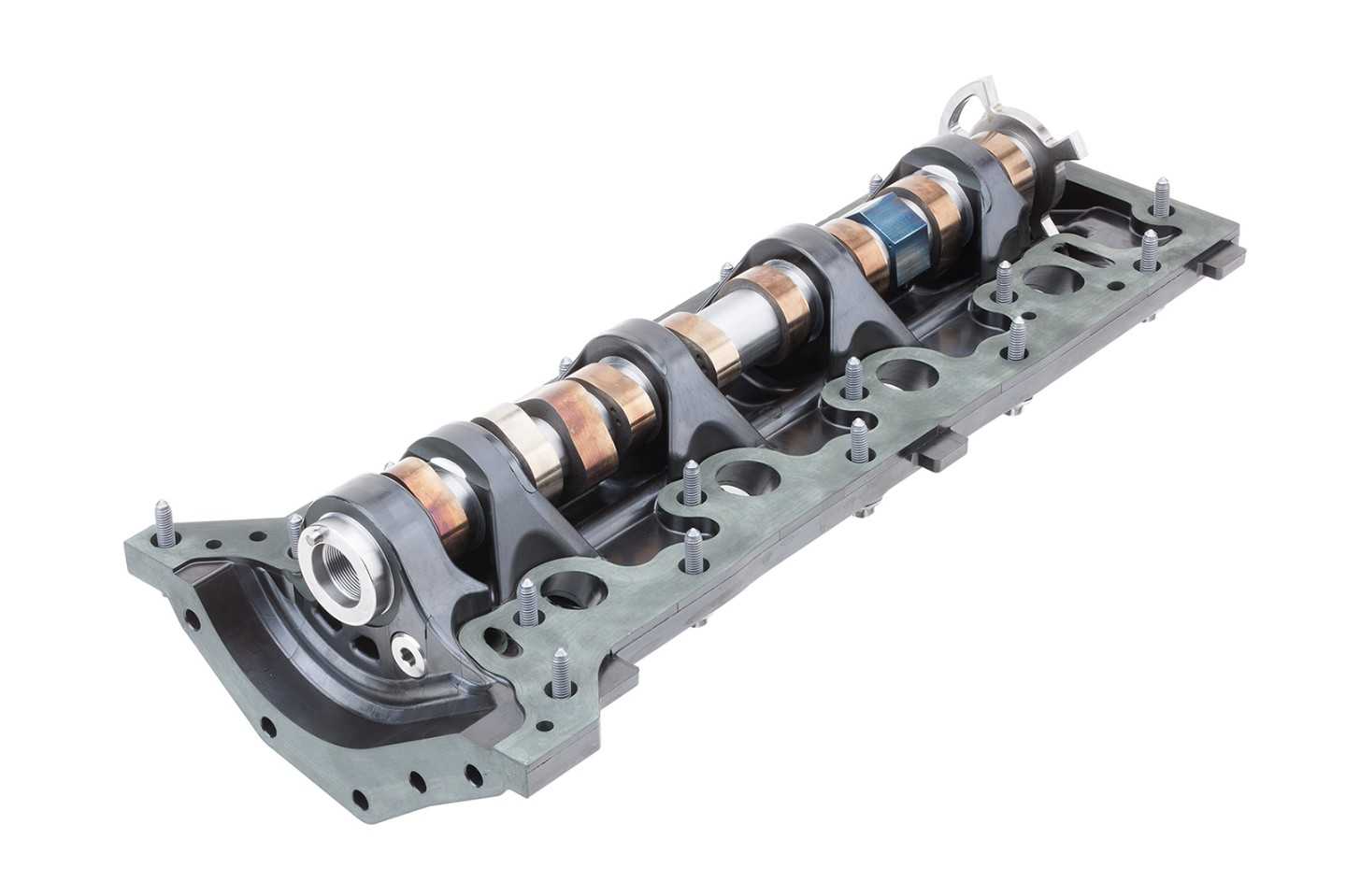 Klimaschonend ist das Bauteil schon bei der Herstellung, denn Kunststoffe mit hohem Faseranteil wiesen einen geringeren CO2-Footprint auf als Aluminium. Ganz ohne Aluminium kommt das Nockenwellenmodul allerdings nicht aus und ist deshalb ein gutes Beispiel für Multi-Material-Leichtbau. Weil die Steifigkeit der verwendeten Duromere nur ein Viertel des Werkstoffs Aluminium beträgt, wurden die Lagerböcke für die Nockenwelle kräftiger ausgelegt. Zusätzlich läuft die stählerne Nockenwelle nicht direkt in den Lagerböcken, sondern in Inserts aus Aluminium. Diese nehmen an den hochbelasteten Stellen der Nockenwellenlager die direkten Kräfte auf.