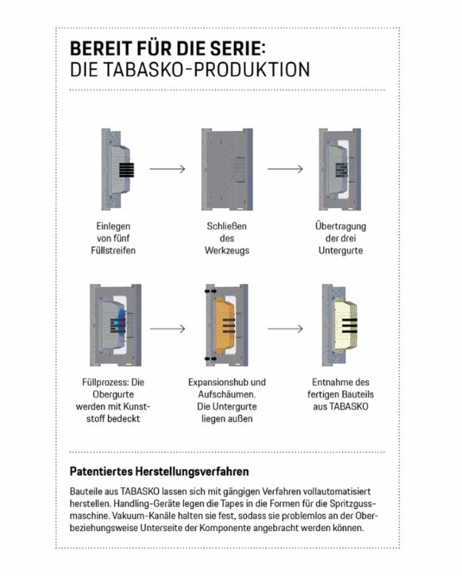 Unter dem Namen „Tabasko“ (Tape‑basierter Kohlefaserleichtbau) hat Porsche Engineering ein Verfahren zur gezielten Verstärkung von Polypropylen-Bauteilen mit Carbonfaser-Tapes entwickelt.