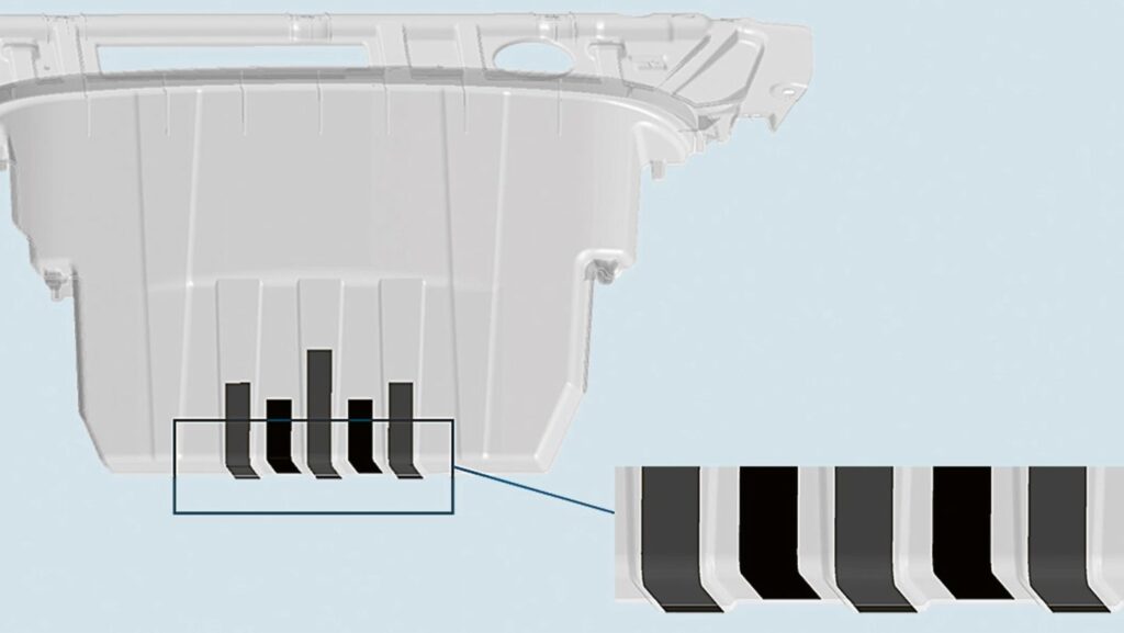 Im Ergebnis stehen 15 Prozent Gewichtsreduzierung und damit ein geringerer Bedarf an PP-GFx. Gleichzeitig war eine um 66 Prozent höhere Druckkraft nötig, um die zulässige Durchbiegung im Stempeldrückversuch zu erreichen. In der Vier-Punkt-Biegeprüfung ergab sich eine um den Faktor 2,5 bis 2,8 höhere Steifigkeit. Auch der Test zur Schlagzähigkeit – wichtig bei Schaumspritzguss – zeigte die Überlegenheit des neuen Verfahrens: Zusammen mit den Tapes war die Schlagzähigkeit um den Faktor fünf besser.