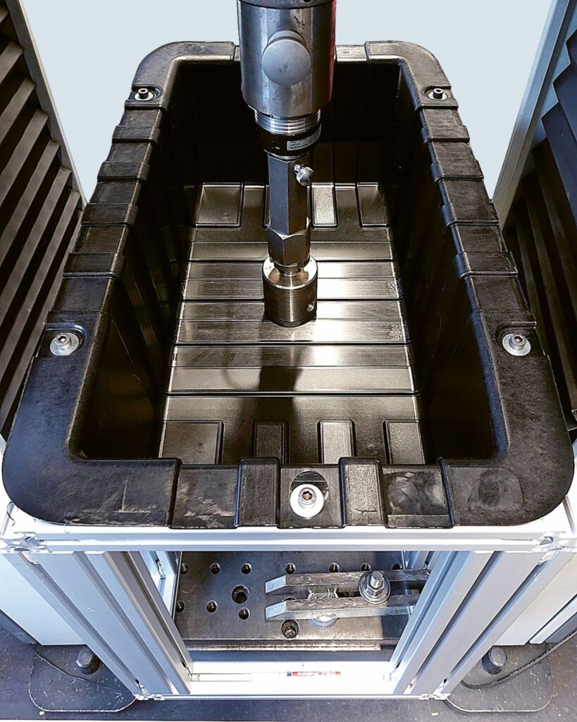 Geprüft wurde das Verfahren anhand einer Taycan-Gepäckwanne (Maße L x B x T von 65 × 120 × 52 cm): Carbonfaser-Tapes der Stärke 0,2 mm verstärken die aus 1,8 mm dickem PP-GFx realisierte Wanne.