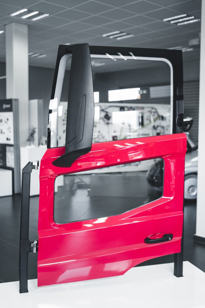 Die Lkw-Tür verbindet dabei den wirtschaftlichen Leichtbau mit einem Plus an Aerodynamik und Sicherheit. Sie hat ein hydrogeformtes Rahmenprofil, das den Sichtwinkel nur sehr wenig verdeckt und trägt so zur Sicherheit anderer Verkehrsteilnehmer bei. Das Frame-Under-Glass-Konzept dient der optimierten Aerodynamik.