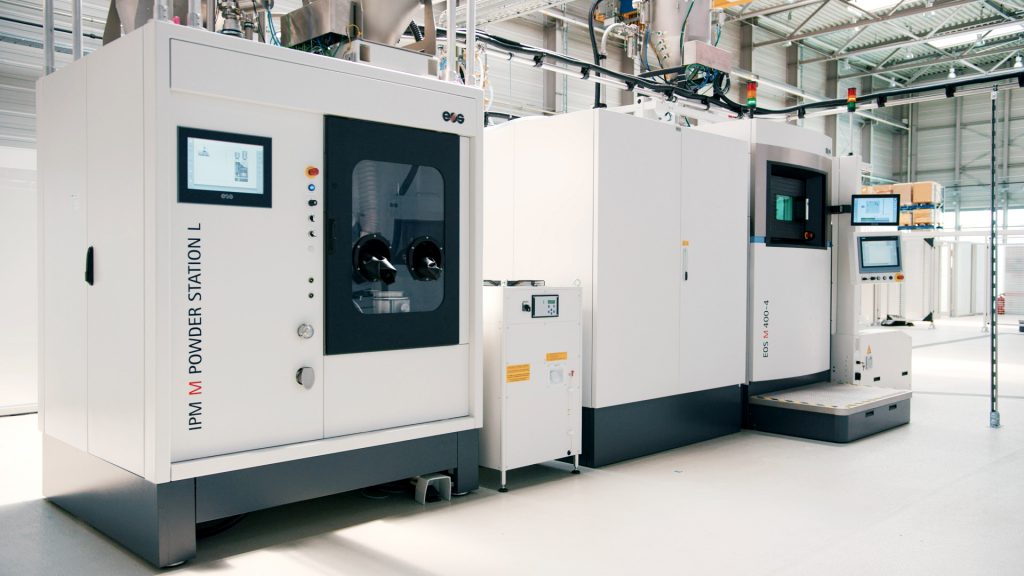 Kern ist das Vier-Laser-System EOS M 400-4 zum metallbasierten industriellen 3D-Druck. Es wird kombiniert mit den Peripherielösungen des Shared-Modules-Konzepts von EOS. Beispielsweise ist das Laser-System mit einer Pulverstation ausgestattet und mit einer allein stehenden Rüst- sowie Auspackstation verbunden.
