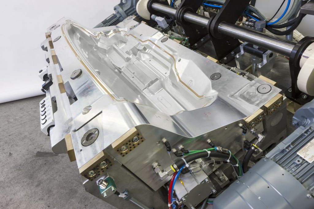 Bild oben: Auch komplexe PUR-Formteile, wie bei dem dargestellten eigenverriegelten Schäumwerkzeug von Frimo, soll zukünftig ohne Trennmittel entformt werden können. (Quelle: Frimo)