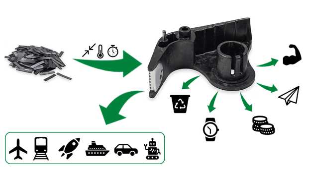 Die Faser-Chips sind kurze, unidirektionale Bänder, die aus einer thermoplastischen Matrix und Verstärkungsfasern bestehen, der Fasergehalt ist sehr hoch. Beim Verpressen unter Druck und Wärme sind der Form der Bauteile nur wenige Grenzen gesetzt – ob präzise Gewindeabformungen, passgenaue Präzisionsbohrungen, integrierte Verbindungselemente oder Wandstärkensprünge.