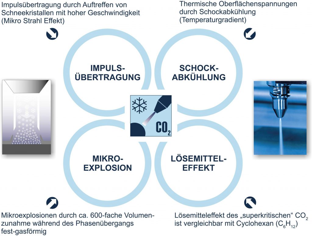 Das im Beitrag beschriebene Verfahren setzt auf flüssiges Kohlendioxid als Reinigungsmedium. Auf der zu reinigenden Oberfläche entstehen durch den CO2-Schnee thermische, mechanische, Sublimations- und Lösemitteleffekte. In Kombination entfernen diese partikuläre (Staub, Späne, Abrieb, Mikrograte) und filmische (Trennmittel, Ziehöle, Emulsionen, Silikone, Schmauchspuren) Verunreinigungen reproduzierbar, so das Unternehmen.