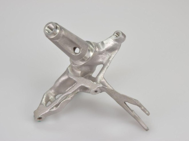 Die Dämpfergabel besteht herkömmlicherweise aus einer gesenkgeschmiedeten Aluminium-Gusslegierung. Die Herstellung umfasst die Produktionsschritte Gießen, Gesenkschmieden, Entgraten, Wärmebehandeln und Fräsen. Bei der additiven Fertigung kam das Laser Beam Melting (LBM) zum Einsatz. Bei diesem selektiven Laserschmelzen wurden zwei verschiedene Aluminiumpulver lokal geschmolzen und Schicht für Schicht auf einer Grundplatte aufgebracht.