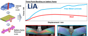 Um das Gesamtgewicht eines Elektrofahrzeugs zu reduzieren und seine Leistungsfähigkeit zu erhöhen werden derzeit Faser-Metall-Laminate speziell für den Rahmen des Batteriegehäuses getestet, um deren mechanische Eigenschaften zu nutzen. Die Crashstruktur des Rahmens wird hergestellt, in dem zwei U-Profile geformt und durch Hybridfügen zu einem Träger verbunden werden. Die mechanischen Eigenschaften zeigen in einem seitlicher Pol-Crash durch Dreipunkt-Biegung an einem Längsträger des Batteriegehäuses vielversprechende Ergebnisse. Das gewichtsäquivalente Faser-Metall-Laminat ist etwa dreimal steifer und fester als das stählerne Referenzmaterial.